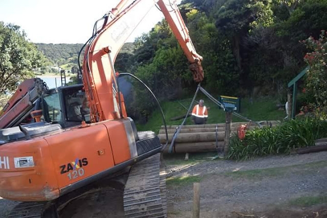 | Julian parks his logs anywhere he likes. This is the access to the local urupa (cemetery). Locals are disgusted. |